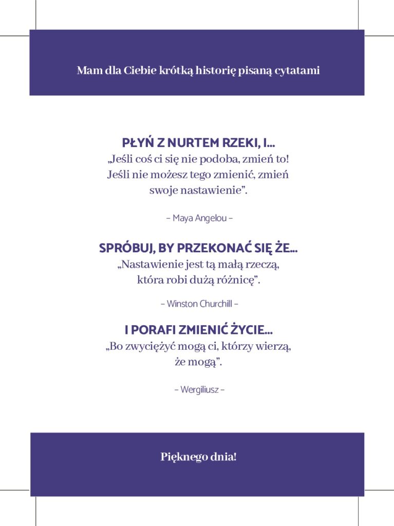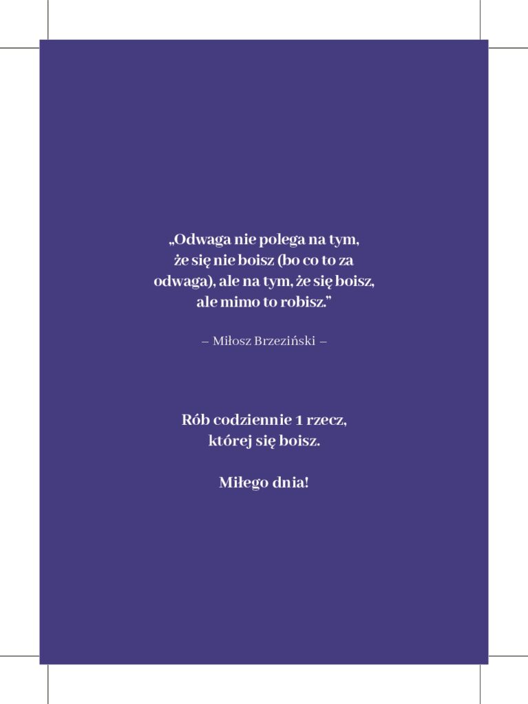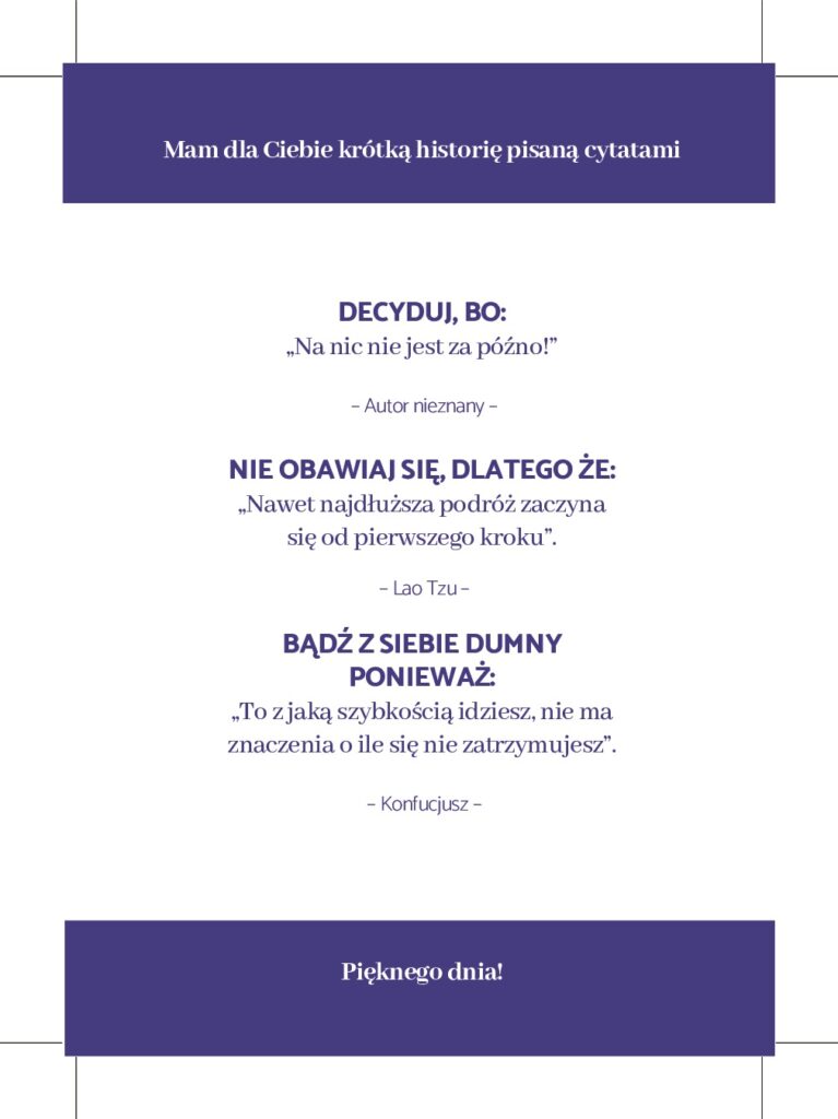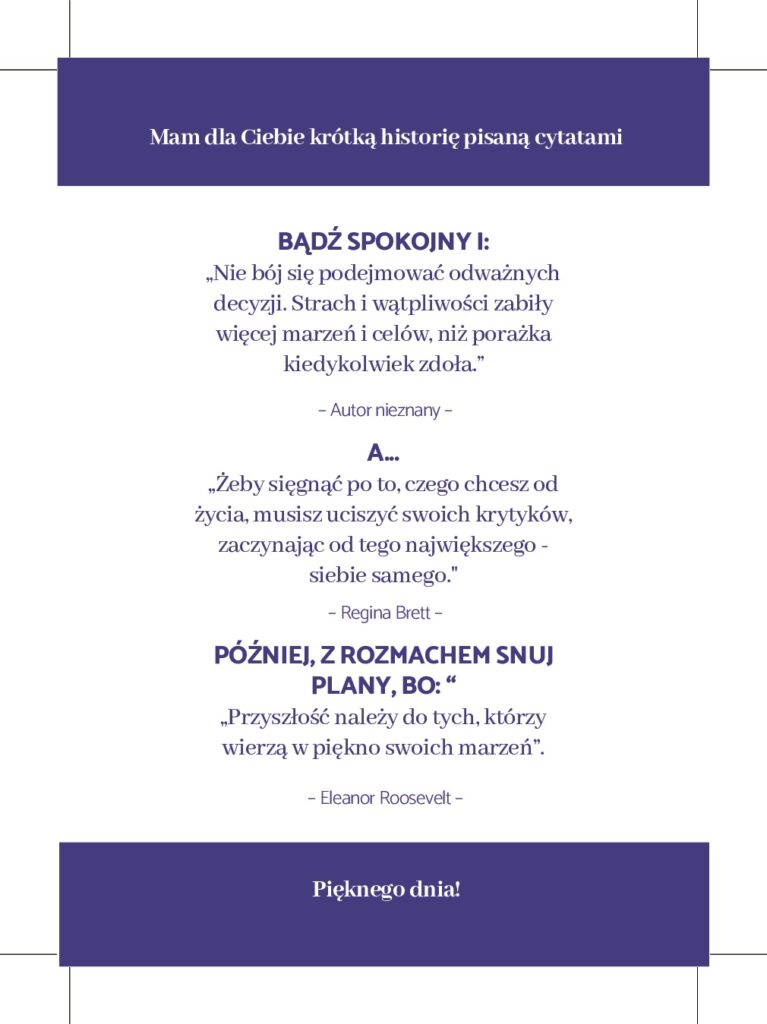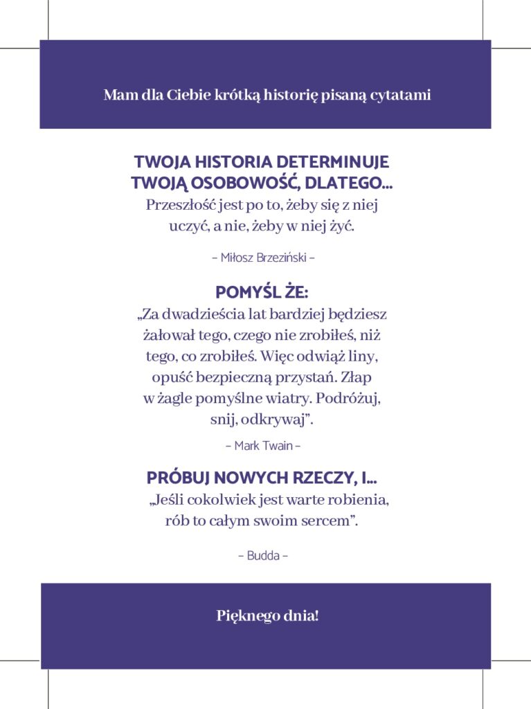Wypisz wszystkie swoje sukcesy (możesz się skupić tylko na obszarze prywatnym lub zawodowym albo na obu jednocześnie – w zależności gdzie czujesz większą potrzebę do pracy). Pamiętaj, że nie muszą to być spektakularne sukcesy. Możesz cofnąć się pamięcią nawet do czasów szkoły. Pomocna również może być galeria w telefonie (często uwieczniamy sukcesy) oraz rozmowy z najbliższymi.
